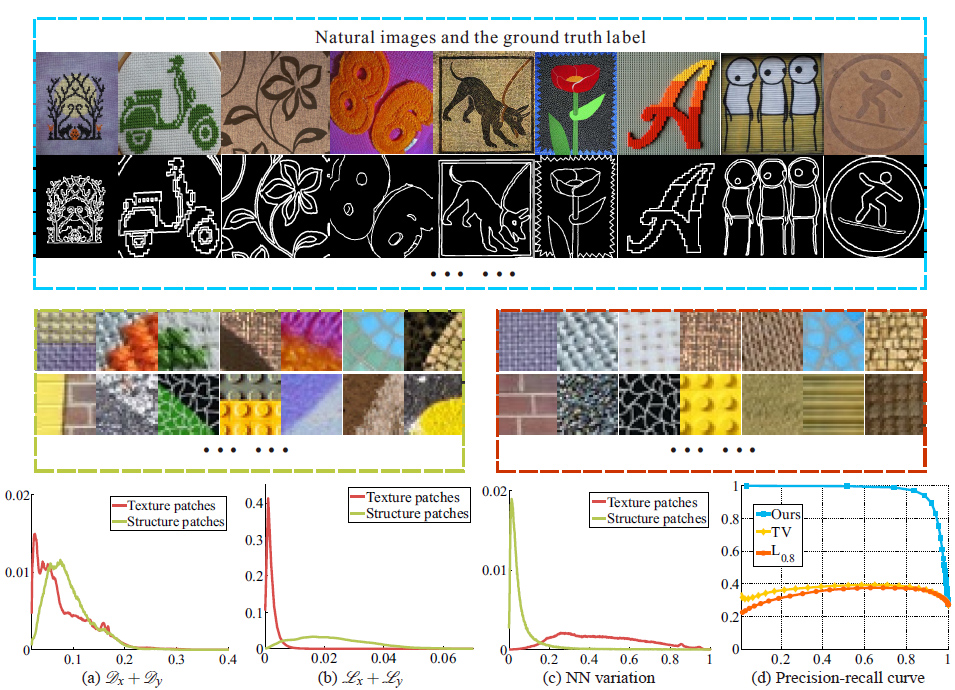 To evaluate our normalized natural variation measure quantitively, we collected 200 images from internet, and asked five helpers to label the structure in each image. Some sample images are shown in the above figure. The bottom row are plots of the distribution of total variation , natural variation